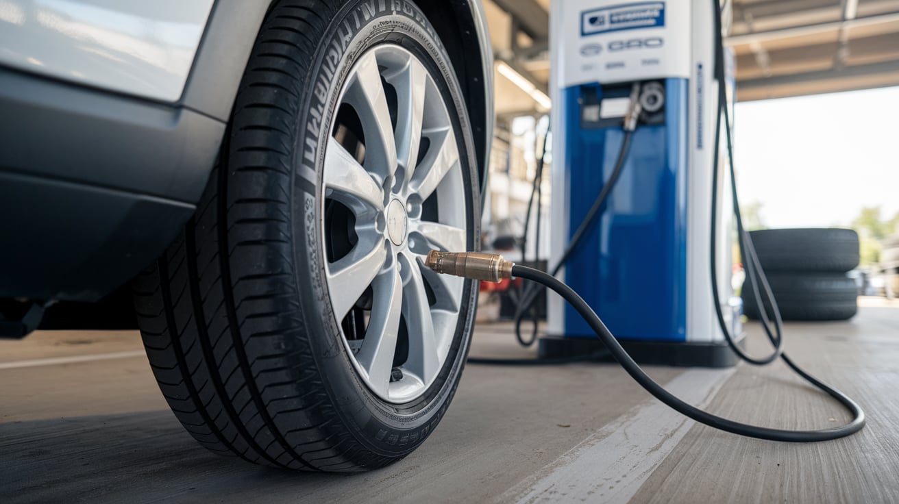 Use the handbrake and park your car on a level surface before pumping air into your tires. By doing this, any unintentional rolling during the inflation process is avoided. Using a gauge to check the tire pressure will help you figure out how much air is needed.